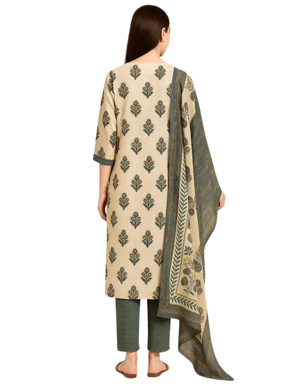 The kurti features a flattering V-neck design and 3/4 sleeves, complemented by a coordinating pant and a beautifully printed dupatta. Its soft, breathable fabric ensures comfort throughout the day, making it ideal for casual outings, office meetings, or festive celebrations.